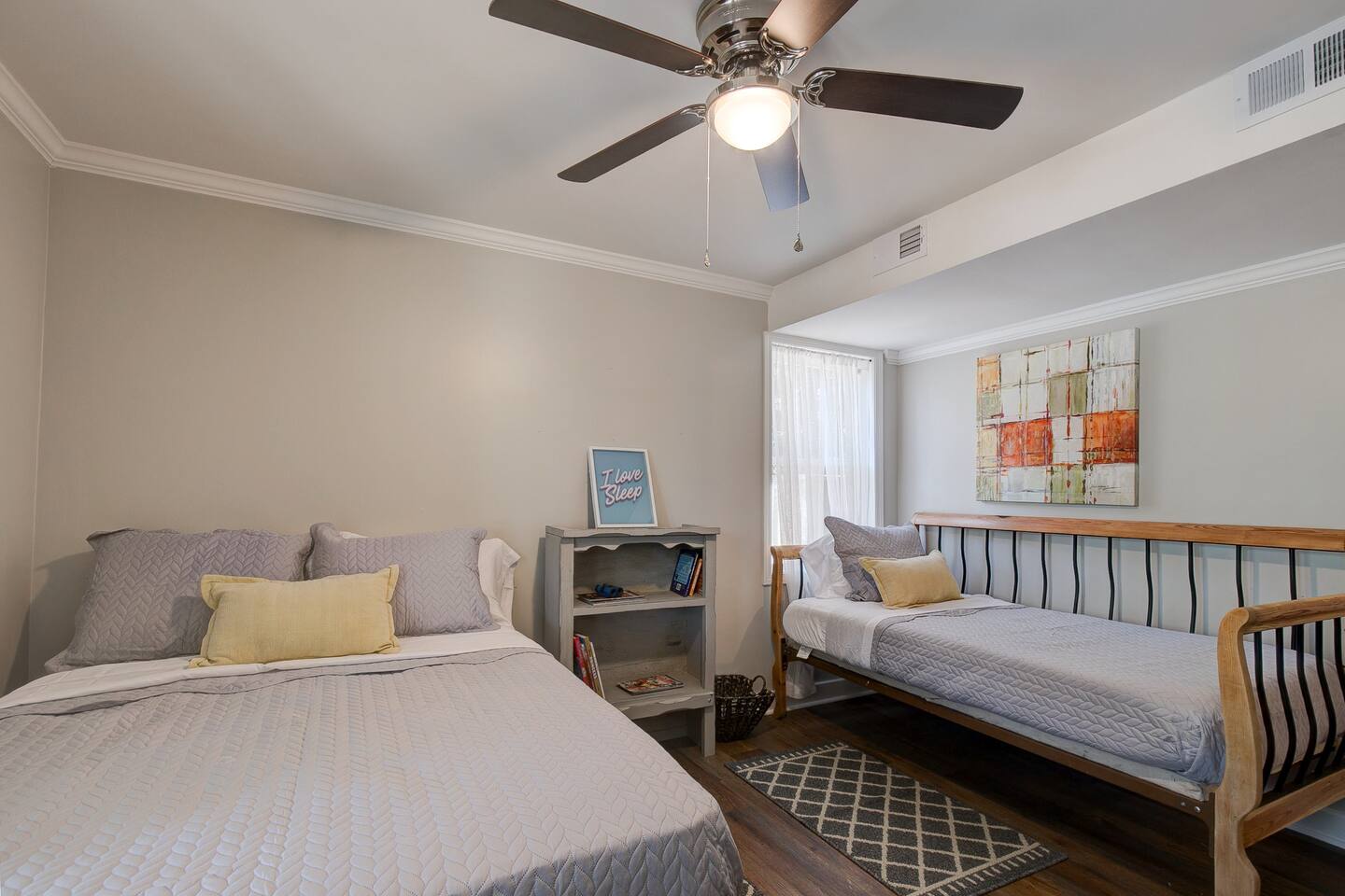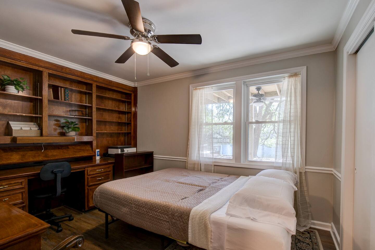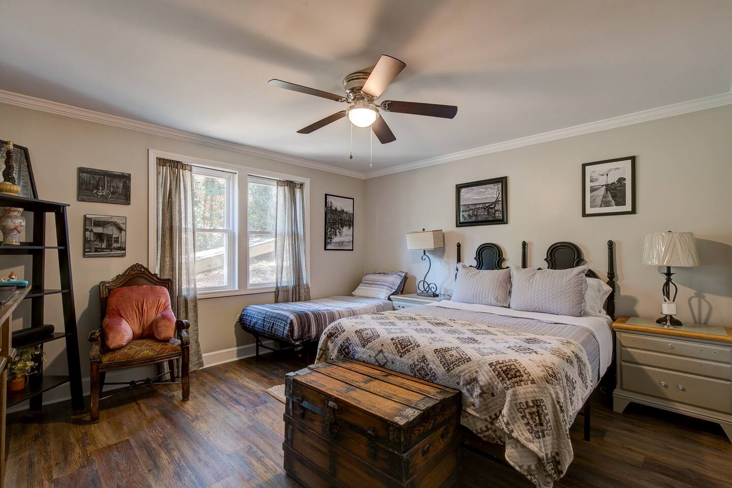 No one feels crowded here — the home offers separate hangout zones ideal for multi-family stays. Main Living Area • Large comfortable sectional • Open gathering space • Direct access to the outdoor patio & dining area Downstairs Game Lounge • Oversized reclining sectional • Pool table • Board games for all ages • Ideal movie and game nights space Sunroom • Located directly off the game lounge • Screened in downstairs sunroom • Perfect for a morning coffee by the water Comfortable sleeping arrangements allows for you to bring you’re entire group with ease: Primary Suite (Upstairs) • Split king bed • TV and private sitting area • Direct access to the upper deck w/ creek views Library Bedroom (Upstairs) • Full-size bed • Located near a full bathroom • Books & reading nook The Office (Downstairs) • Queen bed • Smart TV • Dedicated desk workspace Back Bedrooms (Downstairs) • One bedroom with Queen + Twin • One bedroom with Full + Twin There are 2 full bathrooms upstairs - one en-suite in the primary room and one hall bathroom. Downstairs there is one full bathroom. One of the home’s standout features is the two-level back deck overlooking a scenic creek, creating a quiet retreat after busy days exploring Columbia. Enjoy: • Two outdoor fire pits for evening gatherings • Gas grill for cookouts • Outdoor dining table for group meals • Peaceful wooded creek views • Screened sunroom with sliding patio doors for year-round comfort Perfect for morning coffee, graduation celebrations, or relaxing after a football game. Enjoy space, comfort, and creekside relaxation — all just minutes from Columbia’s most popular destinations.